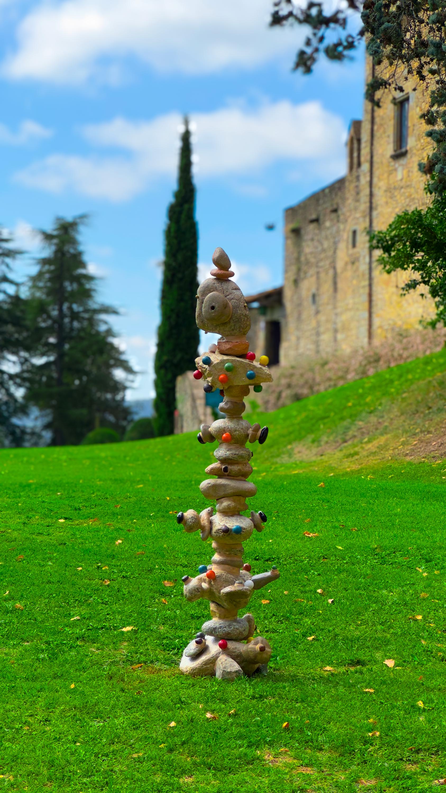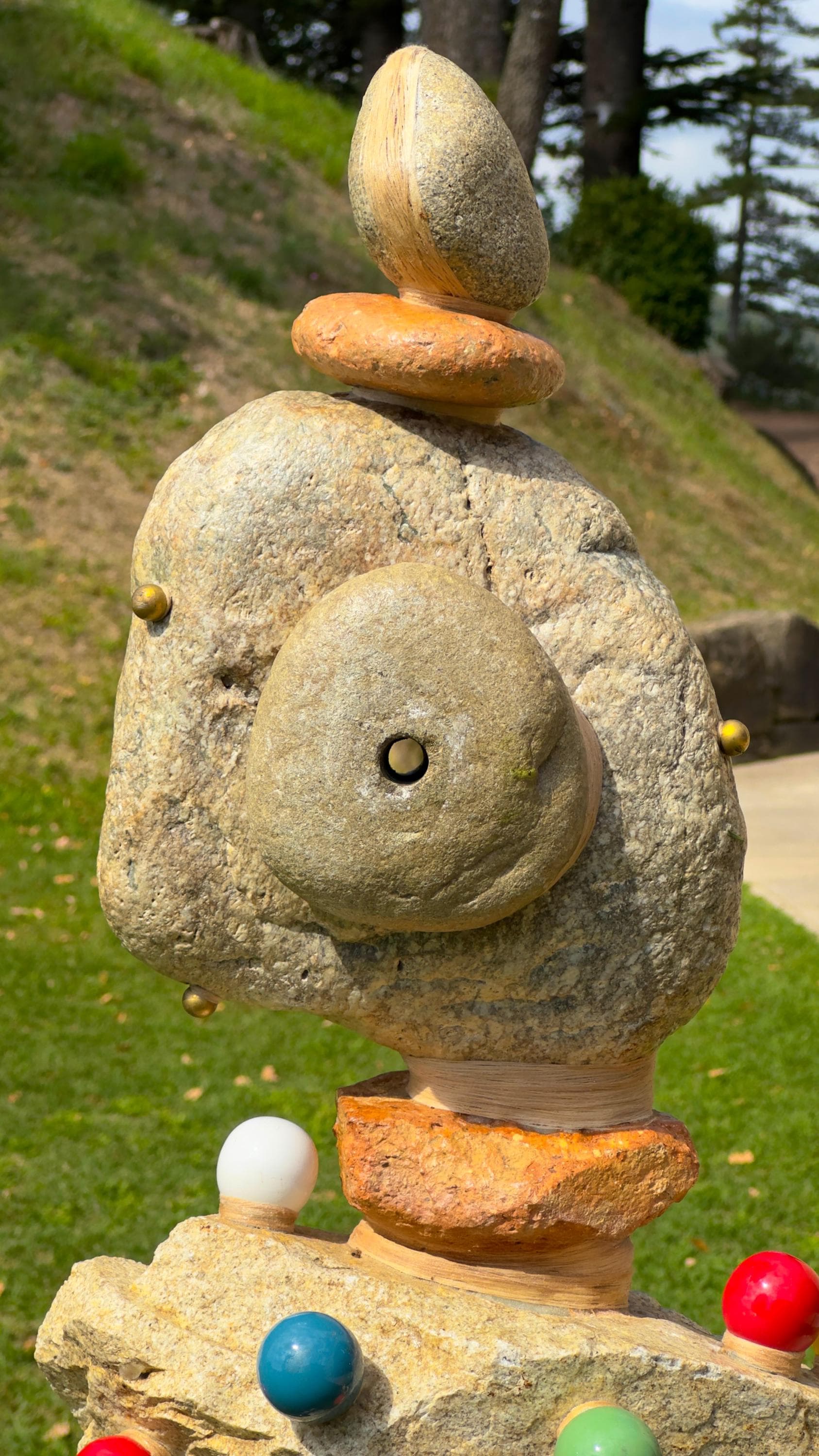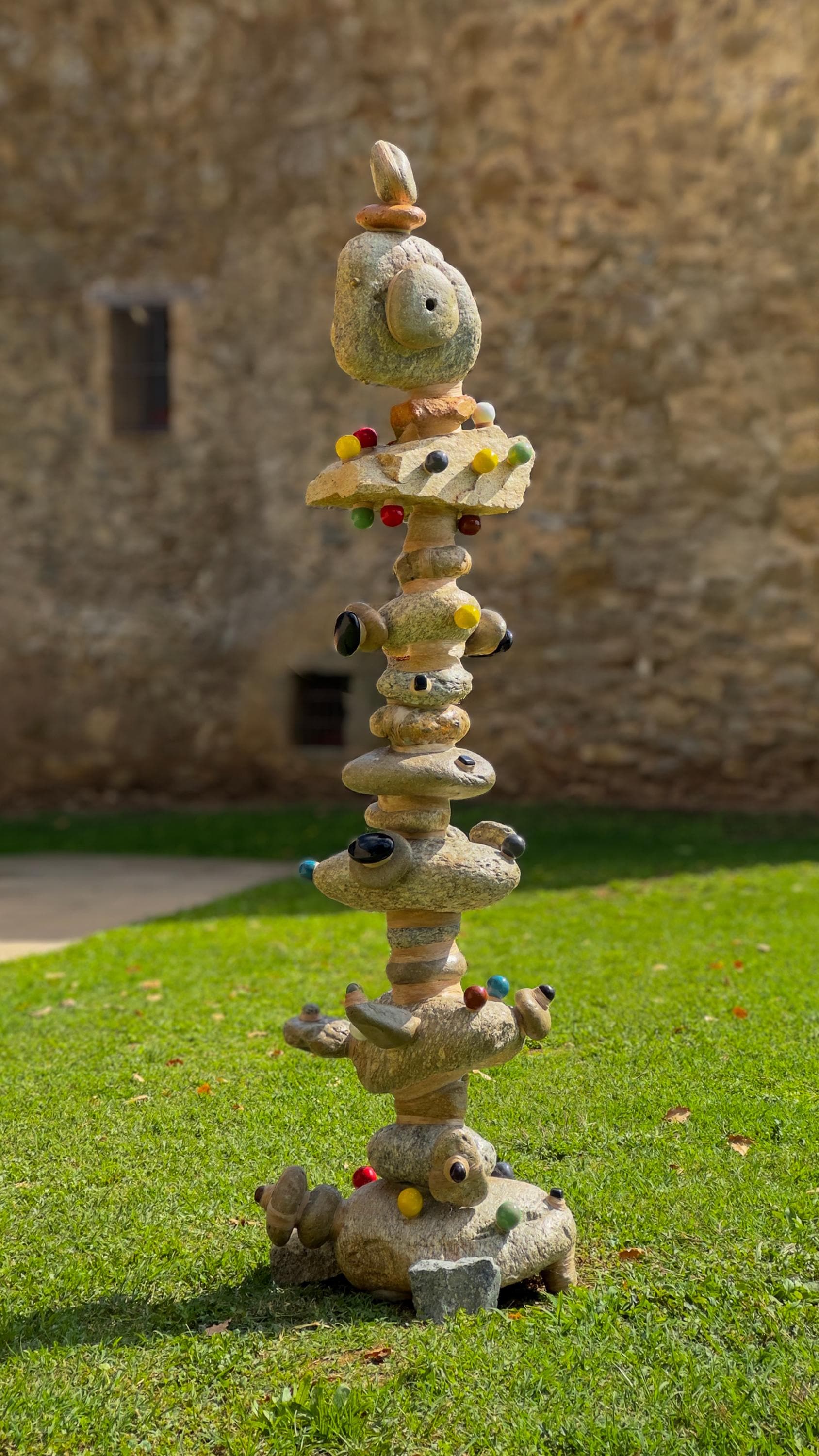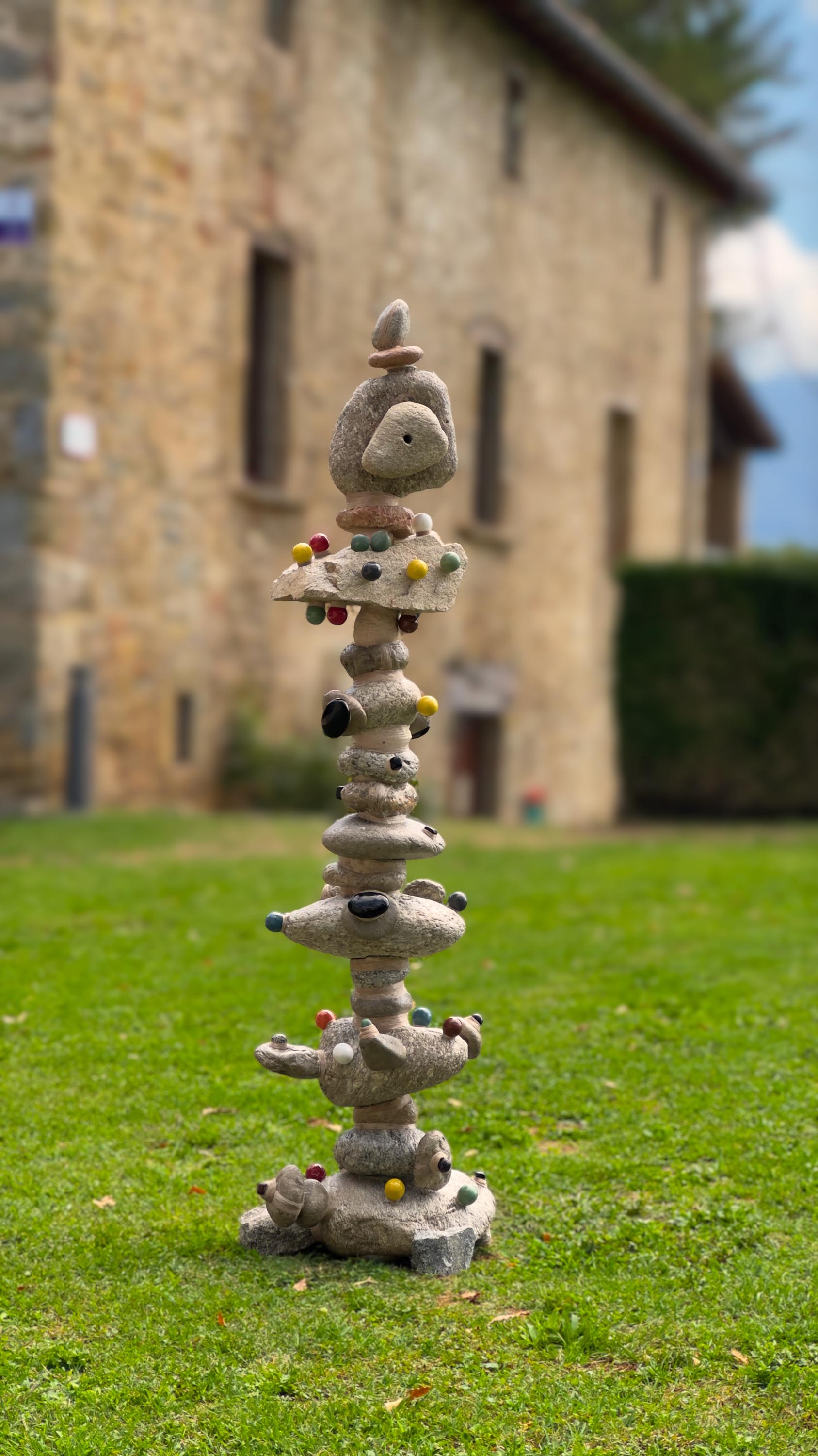 Sculptures made from river stones shaped over millennia, combined with steel and thread. It symbolises time, nature, and human craft, honouring textile workers and connecting urban space with natural history. A contemplative piece blending strength and fragility, rooted in ancestral memory and future vision.